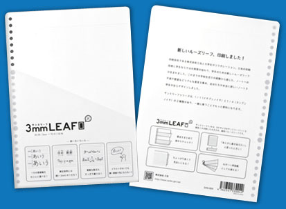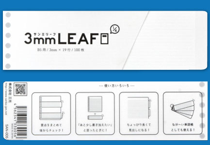 B5用紙の1/4サイズのルーズリーフ。通常のルーズリーフと併用し、そのページの要点をこのサンミリーフ1/4に書き込み必要な箇所に綴じたり、1ページで書き切れずあと少し書き足したいという時に使ったり、サンミリーフ1/4だけで単語帳として使用するなど、ユーザーの目的に応じて様々な使い方ができます。