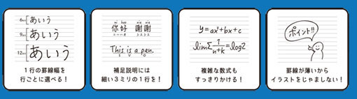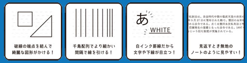 破線の罫線を一行ごとにずらすことで千鳥格子状の配列とし、破線やその端点を利用することで文字や図表が美しく書けるノートです。
